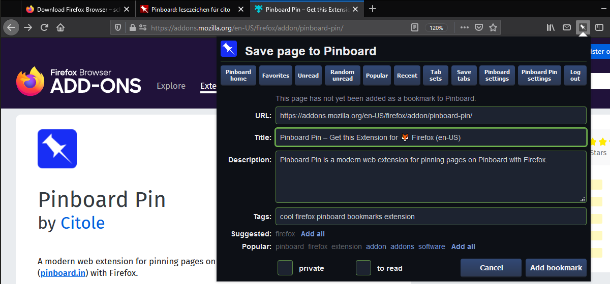 Pinboard Pin Web Extension for Firefox